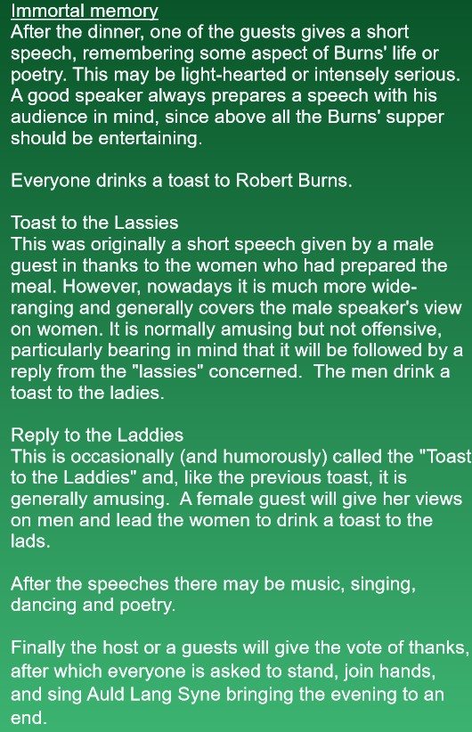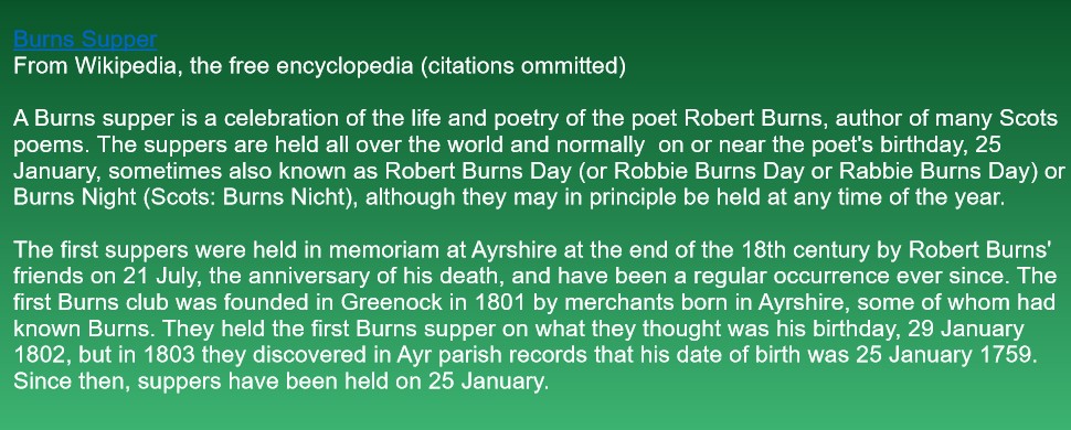 The Annual Burns Supper is the premier event held by the SJCS. The SJCS's 21st Annual Burns Supper will be held on January 24, 2026 at: